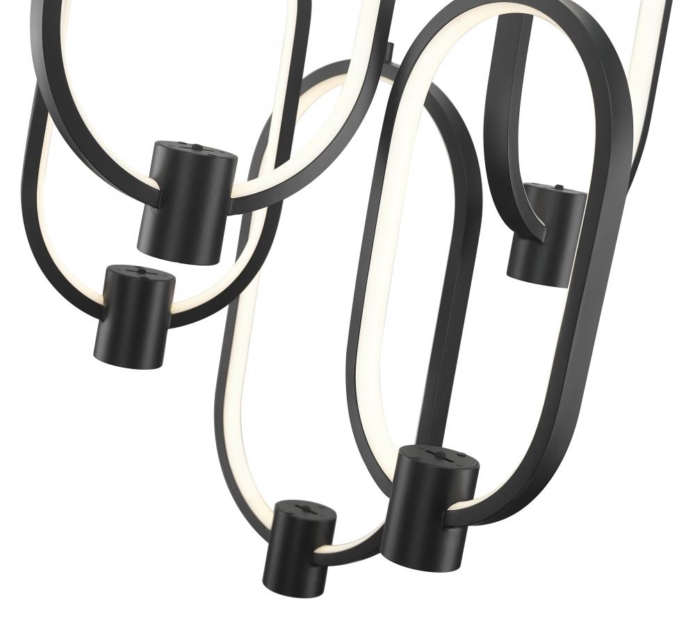 Suspending open metalwork ovals creates a notable design in this five-light LED chandelier perfect for updating kitchens, dining rooms, and living areas. Bold black matte aluminum refines the silhouetting of a festive fixture delivering LED lighting. Dimming functions add critical and useful mood lighting levels.