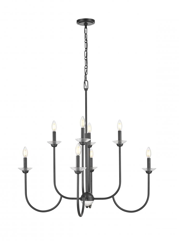 Delicate floral bobeches, in interchangeable white metal and clear glass, highlight this transitional eight-light chandelier. Perfect over a foyer or in your dining room, it offers a clean, fresh ambiance with a center sphere of clear glass and a matte black finish that adds contrast and depth. Curvy arms create a two-tiered silhouette and ensure an inviting ambiance in any setting.