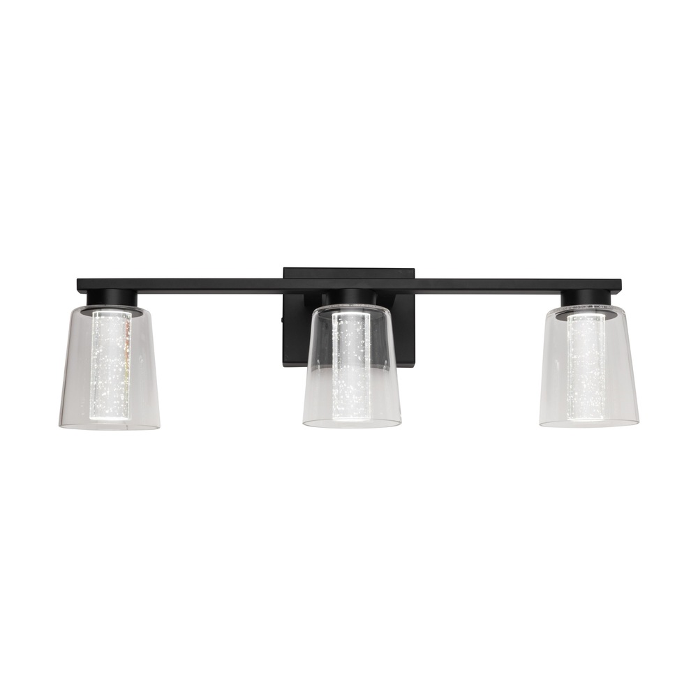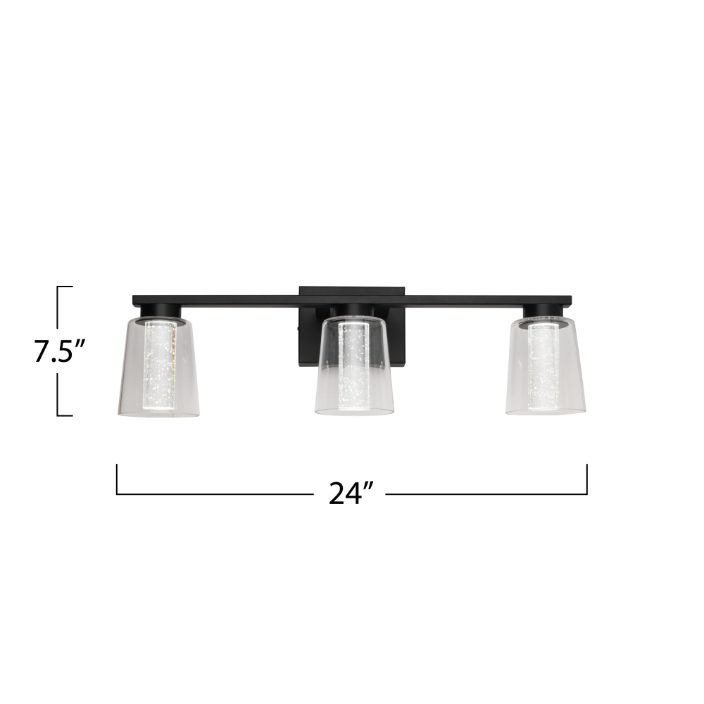 The Dalton Collection features a distinctive design with a clear outer glass surrounding a interior seeded cylinder glass, creating a unique and modern aesthetic. The LED lighting is skillfully integrated to accentuate the seeded glass, providing a visually striking and exceptional effect. Show in with a black frame (also available in chrome). Additionally, these models have a built-in LED switch, allowing users to effortlessly adjust the color temperature from 3000, 4000, and 5000 kelvin for a customizable lighting experience. This collection seamlessly combines functionality with an eye-catching design, making it an elegant choice for any bathroom space. 3 light wall sconce shown. (Also available in a single and 4 light versions.)