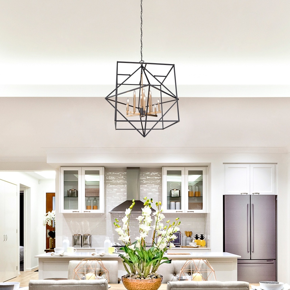Linear in design, the Roxton collection is comprised of a matte black exterior cage which a diamond within a square that encases a harvest brass inner chandelier cluster. 12 light shown (smaller versions available)