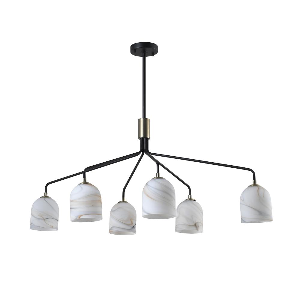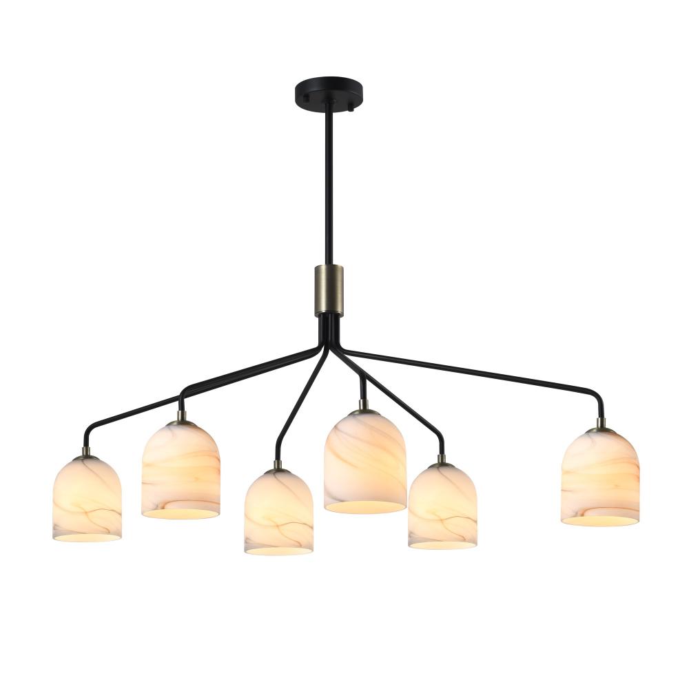 The Crema collection 6 light oval chandelier by Steven Sabados of S&C radiates understated sophistication with its alabaster-style swirl glass, casting a warm, inviting glow. Its sleek black frame is beautifully complemented by brushed brass accents, creating a perfect harmony of modern sophistication and classic charm. Rods included for easy height adjustment to suit different height requirements.