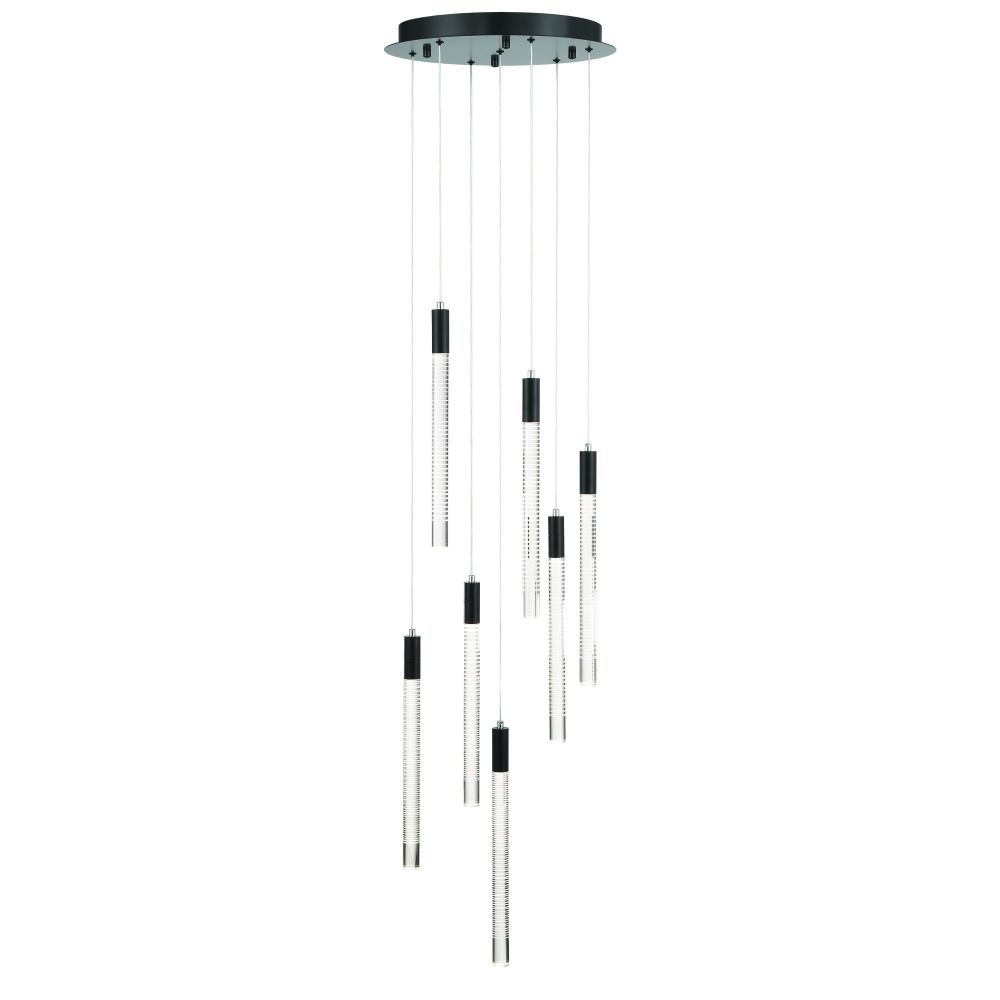 The Celine 7 light chandelier is a stunning masterpiece of modern elegance, featuring a black canopy and holders that exude warmth and sophistication. Its clear glass rods, adorned with intricate laser-etched lines, create a mesmerizing play of light and texture. Illuminated by LED technology, this chandelier offers a blend of energy efficiency and brilliance. With easily height-adjustable wires, it adapts seamlessly to any space, making it a breathtaking centerpiece for contemporary interiors. Great for an entry, foyer, or over a large dining room table.