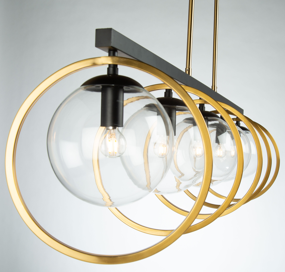 From the Lighting Pulse design firm, this Lugano collection 5 light linear island chandelier features clear round glassware which is complimented by vintage brass encasings on a black frame.