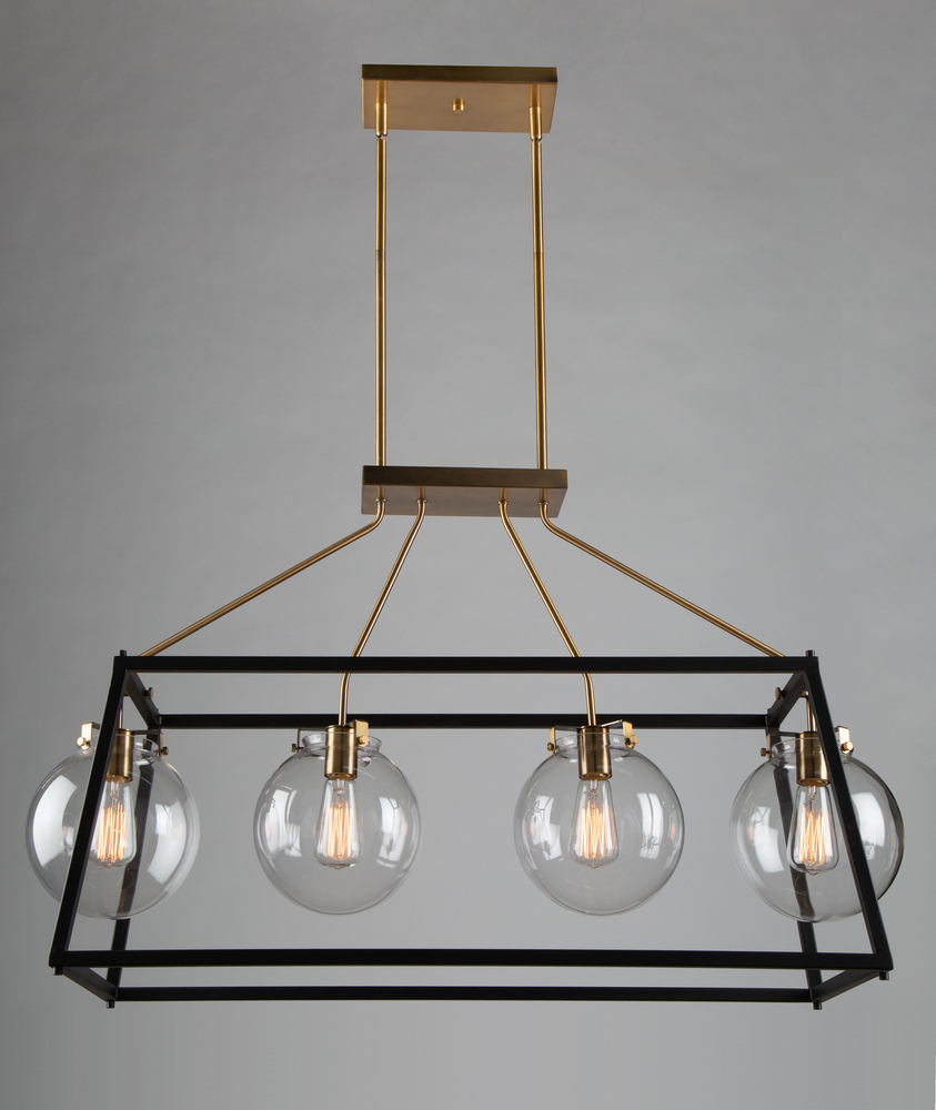 The "Bridgetown" collection 4 light linear pendant features a clean and transitional design. The outer frame is a black tapper rectangular while the interior is plated in a rich harvest brass. The glassware is clear and circular.
