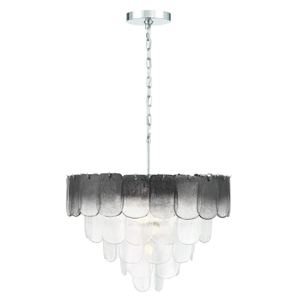 The chandelier from the Bianca collection exudes elegance with its cascading clear “Piastra” glass panels that shimmer like delicate ice sculptures. (The top row of glass features smoke panels with the balance of the frame has clear glassware). These textured glass elements are gracefully suspended from a polished nickel frame, radiating a sense of refined artistry and grace. (Medium size model shown)