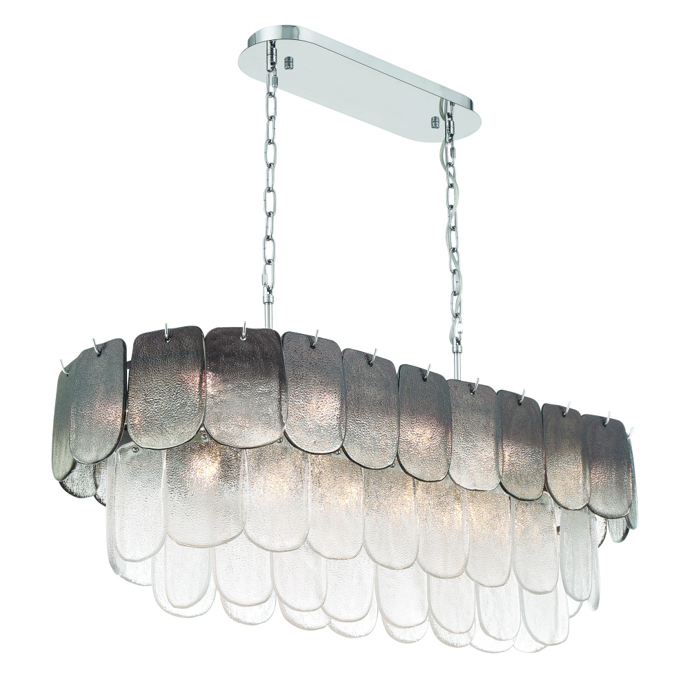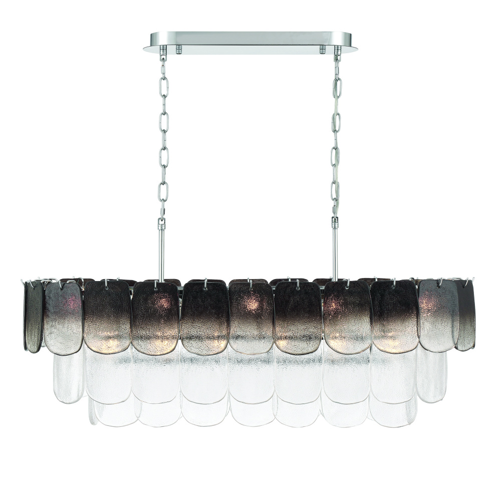 The linear island type chandelier from the Bianca collection exudes elegance with its cascading clear “Piastra” glass panels that shimmer like delicate ice sculptures. (The top row of glass features smoke panels with the balance of the frame has clear glassware). These textured glass elements are gracefully suspended from a polished nickel frame, radiating a sense of refined artistry and grace. A perfect addition to any dining room with rectangular table or perhaps in a kitchen over an island.