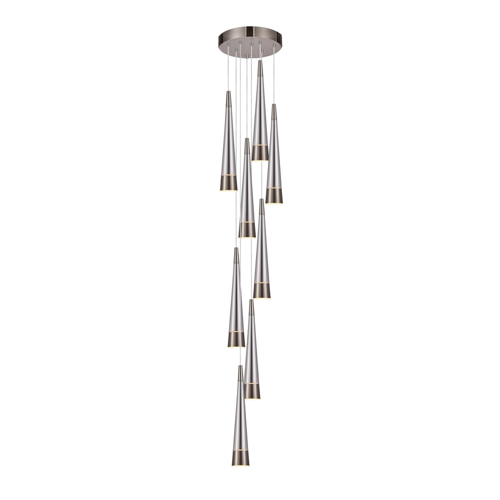 The Sunnyvale collection boasts a distinctive cone-shaped design adorned with metalwork on both the top and bottom, enveloping a captivating smoke tinted center glass complimented with pearl black framing. The pendant's exquisite craftsmanship and attention to detail result in a contemporary yet elegant aesthetic, making it a standout piece in any interior. With LED illumination seamlessly integrated throughout the glassware, the Sunnyvale collection not only delivers striking visual appeal but also provides efficient and ambient lighting. 9 light foyer model shown. (easily height adjustable)