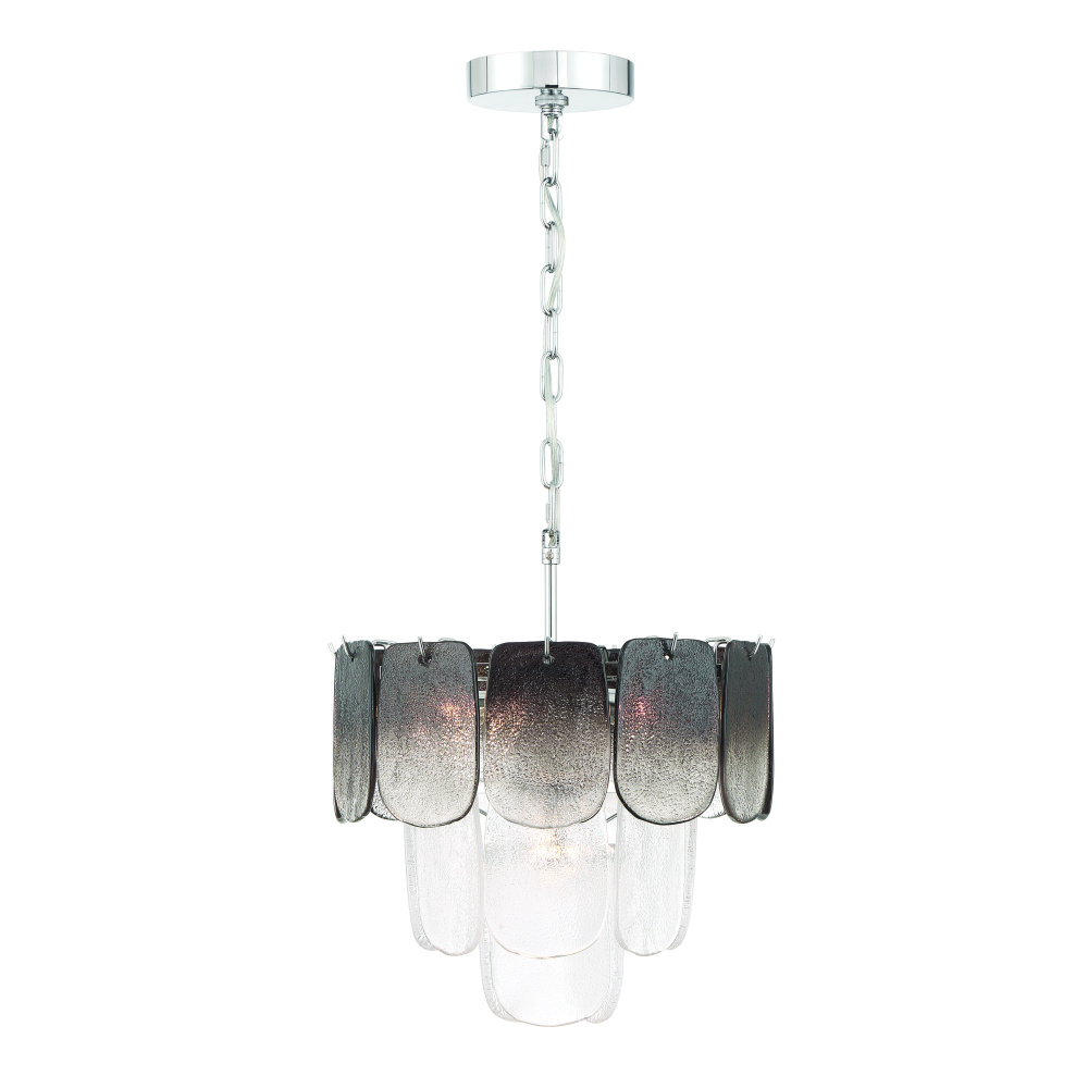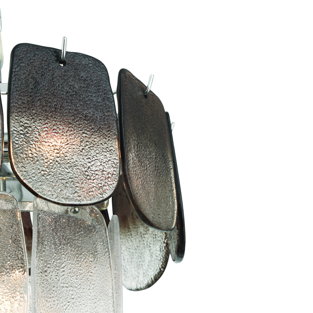 The chandelier from the Bianca collection exudes elegance with its cascading clear “Piastra” glass panels that shimmer like delicate ice sculptures. (The top row of glass features smoke panels with the balance of the frame has clear glassware). These textured glass elements are gracefully suspended from a polished nickel frame, radiating a sense of refined artistry and grace. This model can be used as a small chandelier or a close to celling semi-flushmount.