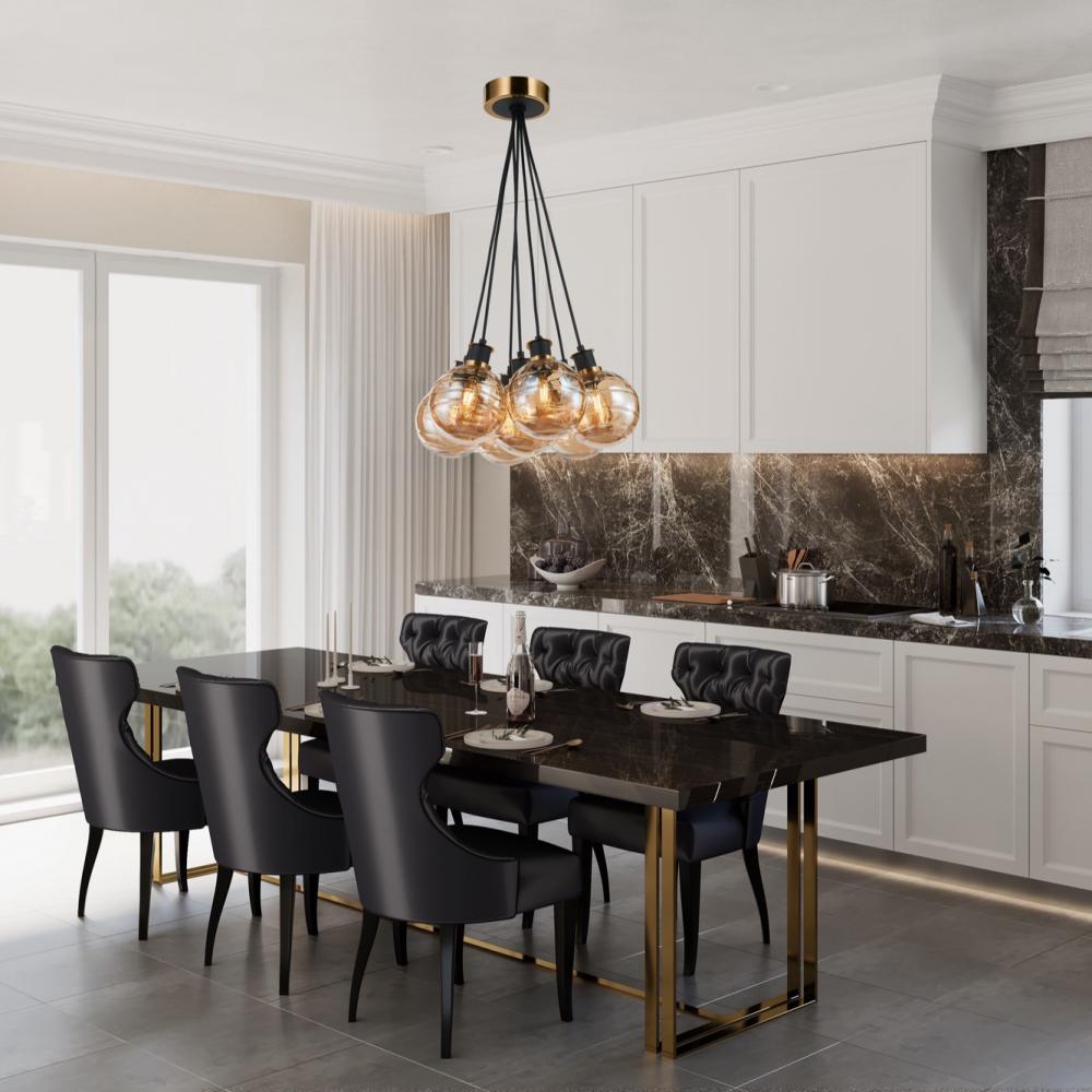 The Gem Collection with champagne glassware has a rich, translucent amber hue with a high level of clarity, allowing light to pass through while casting a warm, golden tone. The model shown is a 7 lite height adjustable cluster type chandelier.