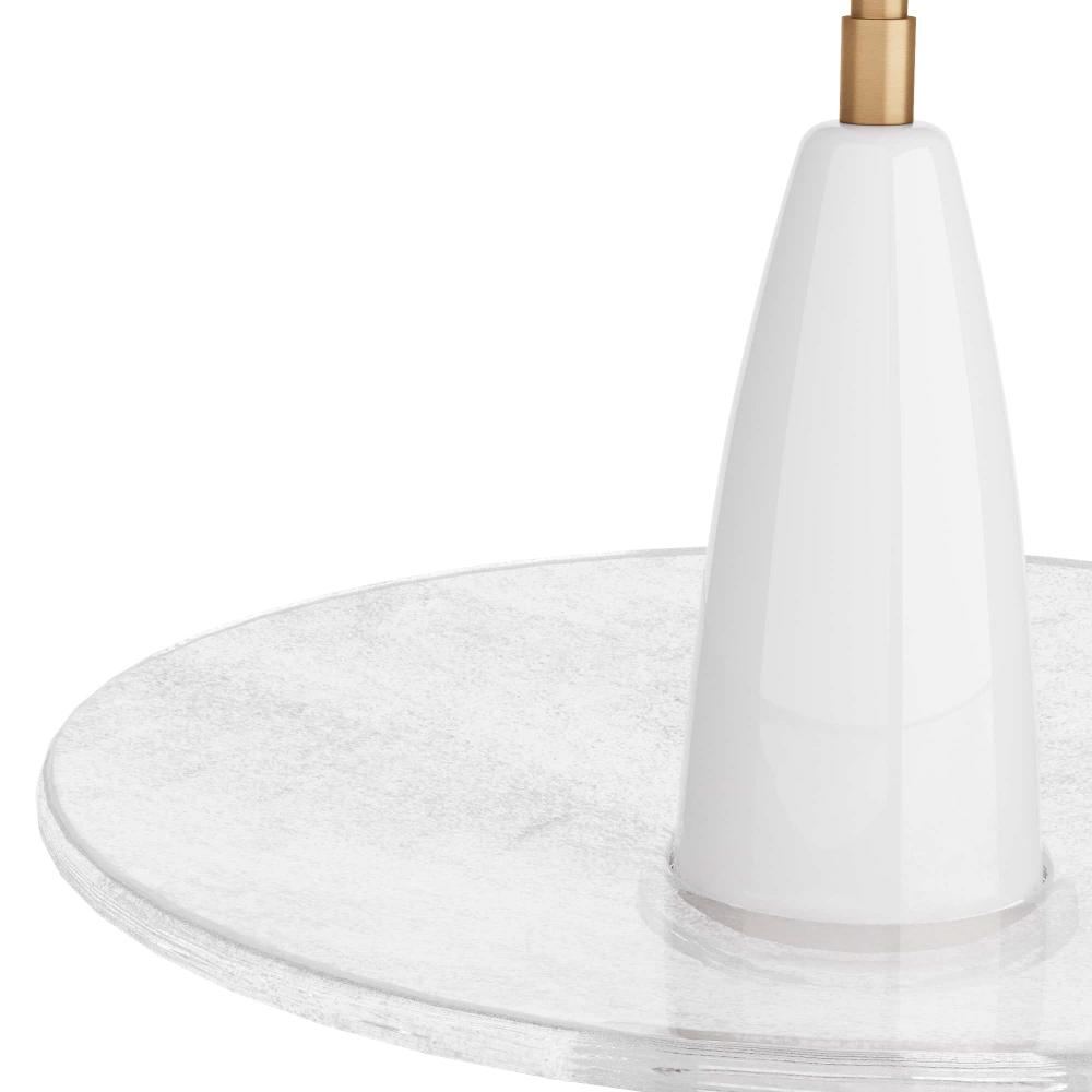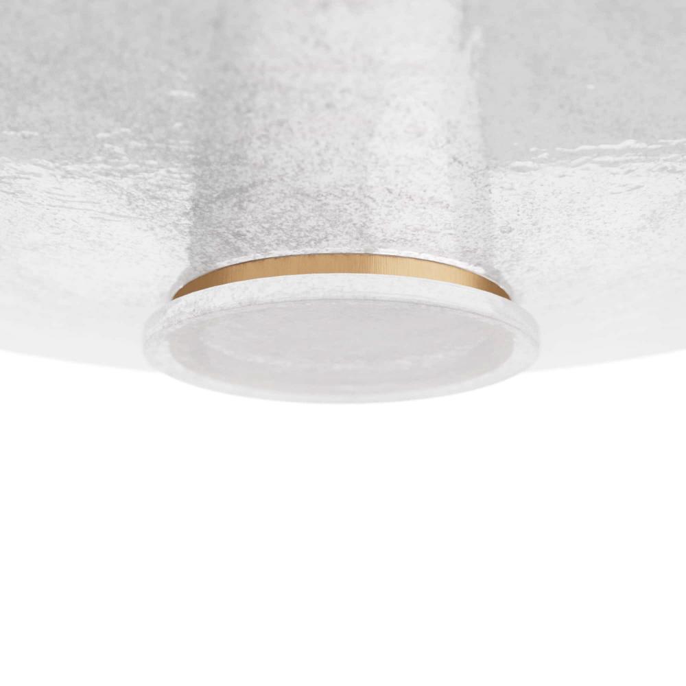 FASHIONED AFTER MIDCENTURY ITALIAN LIGHTING, THE VISILI FLUSH MOUNT IS CREATED WITH AN INVERTED, PAN-SHAPED SHADE OF CLEAR SEEDY SLUMP GLASS. LUSTROUS, OPAQUE OPAL GLASS IN A CONE SHAPE FORMS THE HOUSING FOR AN LED BULB. A CUPPED CANOPY AND SHADE DETAILING IS CREATED IN ANTIQUE BRASS FINISHED IRON. FINISH WILL VARY. DAMP-RATED, ALTHOUGH LIMITED COVERED OUTDOOR CONDITIONS MAY AFFECT FINISH.